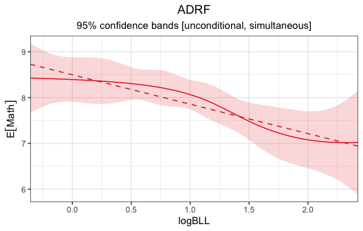 logBLLandMathadjusting for the included potential confounders, based on rejection of the hypothesis that the ADRF is flat forlogBLLvalues between -0.3567 and 2.4248 (p < .0001). There isn’t evidence that the ADRF is nonlinear within this range (p = .3153). The linear projection has a coefficient of -.643 (p < .0001), indicating that the expected potential outcome ofMathdecreases by this amount for each unit increase inlogBLL.