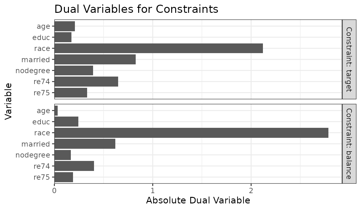 Often \(\bar{x}_k^*\) are chosen to represent a known target group, like the full sample when targeting the ATE or the treated group when targeting the ATT. They can also be chosen to generalize the effect estimate to an arbitrary target population (Chattopadhyay, Cohn, and Zubizarreta 2024) or removed entirely to prioritize group balance over target balance (Barnard, Huling, and Wolfson 2025).